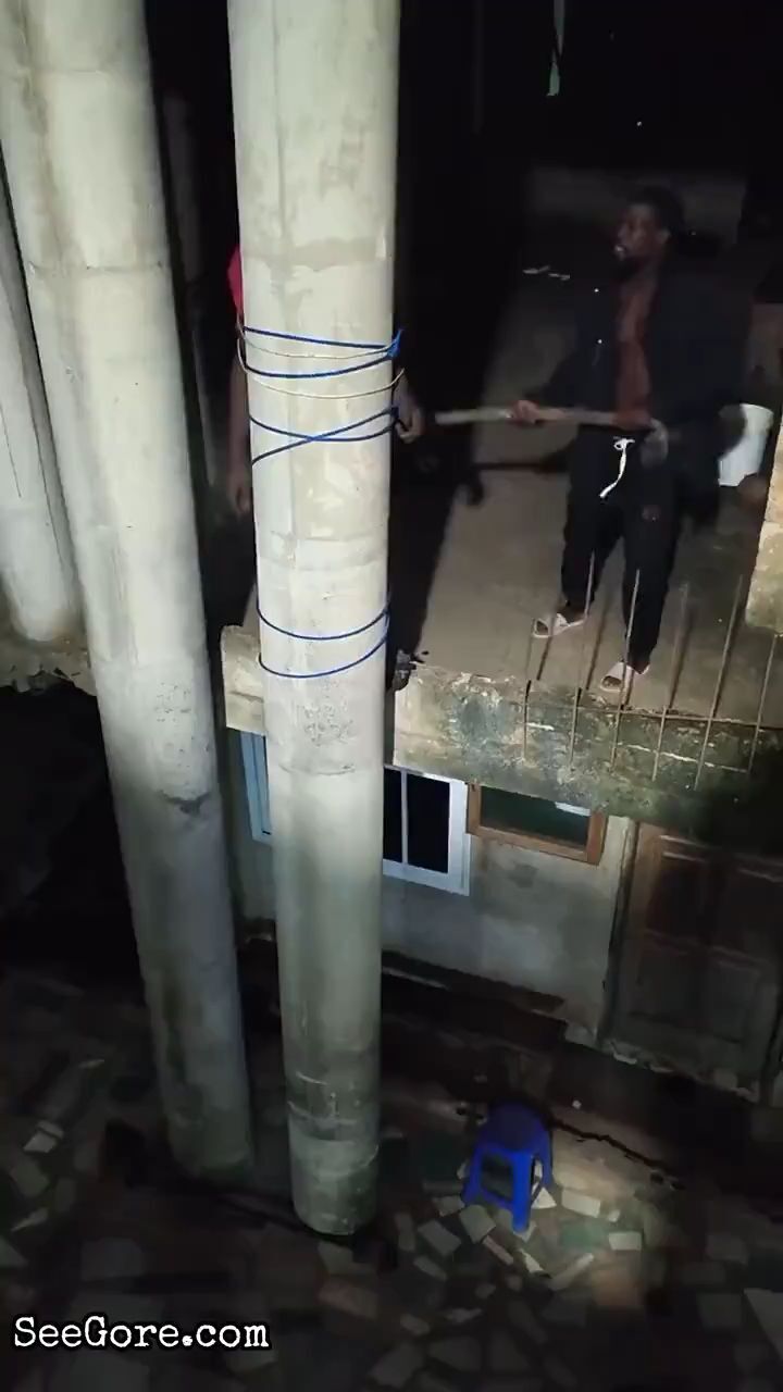 For unknown reason, a man was tied to a pillar of a structure, then hit with a big as pipe or some sort.